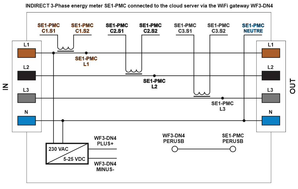 Pokročilý 3-fázový elektroměr SE1-PMC s proudovými vstupy pro miniaturní měřící transformátory umístěné v sekundárním okruhu hlavních silových transformátorů (nepřímé parazitní měření), stejně tak jako další PERUSB moduly, se dnes nejčastěji využívá v kombinaci s bránou NT3-DN4, která umožňuje komunikaci tohoto modulu se SensorFor Cloud serverem. Cloud server zprostředkovává přímé propojení mezi uživatelem a senzory / aktuátory za účelem měření nebo ovládání. Uživatel má tímto způsobem přístup k datům svých senzorů nebo k ovládání svých zařízení prostřednictvím sítě Internet ať se fyzicky nachází kdekoliv.