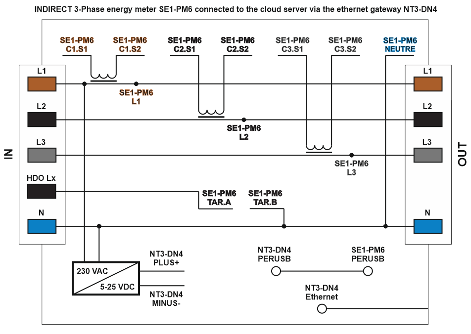 - Pokročilý 3-fázový 2-tarifní elektroměr SE1-PM6 pro nepřímé měření