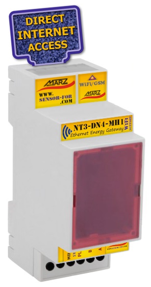 Ethernetová brána NT3-DN4 s WiFi / GSM rozšířením je určena pro připojení senzorů a aktuátorů k SensorFor Cloud serveru. Cloud server zprostředkovává přímé propojení mezi uživatelem a senzory / aktuátory za účelem měření nebo ovládání. Uživatel má tímto způsobem přístup k datům svých senzorů nebo k ovládání svých zařízení prostřednictvím sítě Internet ať se fyzicky nachází kdekoliv. Uživatelem může být samozřejmě jakákoliv jiná autonomní jednotka či systém. Brána NT3-DN4-MH1 v sobě již obsahuje zabudované 4 moduly Modbus čtečka elektroměrů SD5-ME1 umožňující připojit až 72 elektroměrů na jedné sběrnici.
