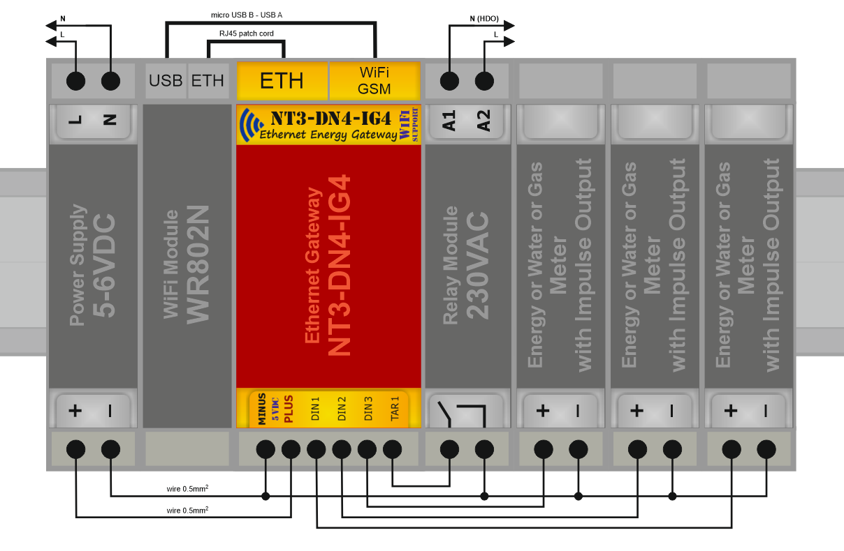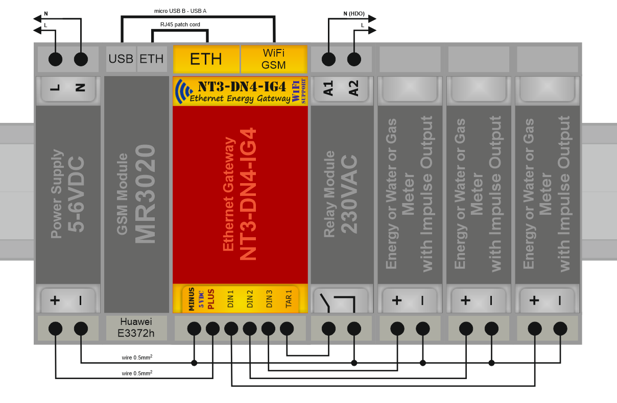 Ethernetová brána NT3-DN4 s WiFi / GSM rozšířením je určena pro připojení senzorů a aktuátorů k SensorFor Cloud serveru. Cloud server zprostředkovává přímé propojení mezi uživatelem a senzory / aktuátory za účelem měření nebo ovládání. Uživatel má tímto způsobem přístup k datům svých senzorů nebo k ovládání svých zařízení prostřednictvím sítě Internet ať se fyzicky nachází kdekoliv. Uživatelem může být samozřejmě jakákoliv jiná autonomní jednotka či systém. Brána NT3-DN4-IG4 v sobě již obsahuje zabudovaný modul 3-kanálového 2-tarifního integrátoru impulsů NT3-IG4.